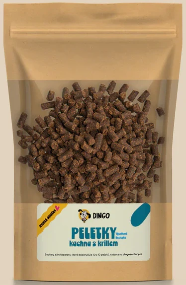 Dingo peletky kachna s krillem 150gSkladem83 Kč/ ks74 Kč bez DPH