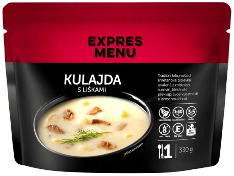 voda, brambory, smetana, vejce, houby lišky obecné (3 %), cukr, ocet, rýžová mouka, kukuřičná mouka, kopr sterilovaný (voda, kopr, ocet kvasný, cukr, sůl), sůl kamenná, pepř.